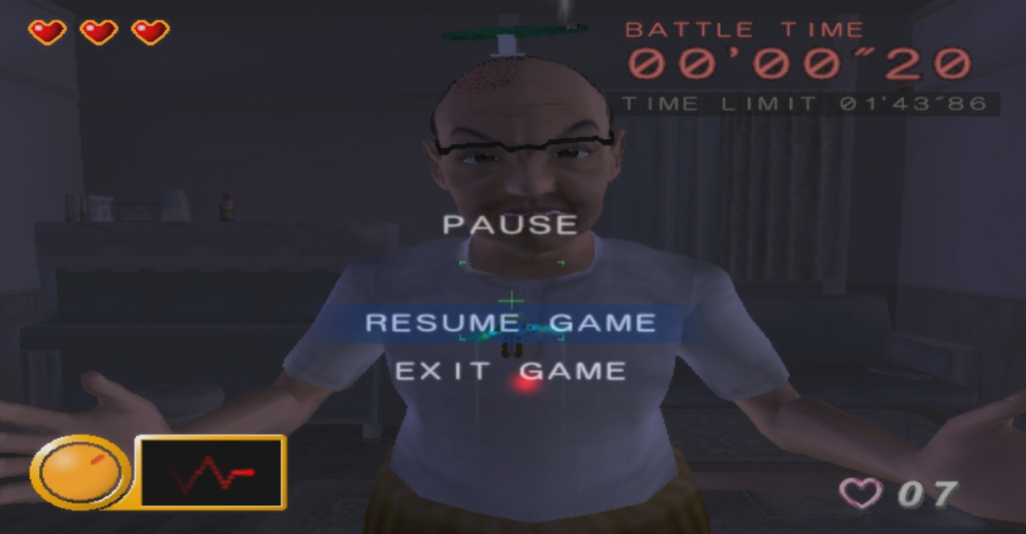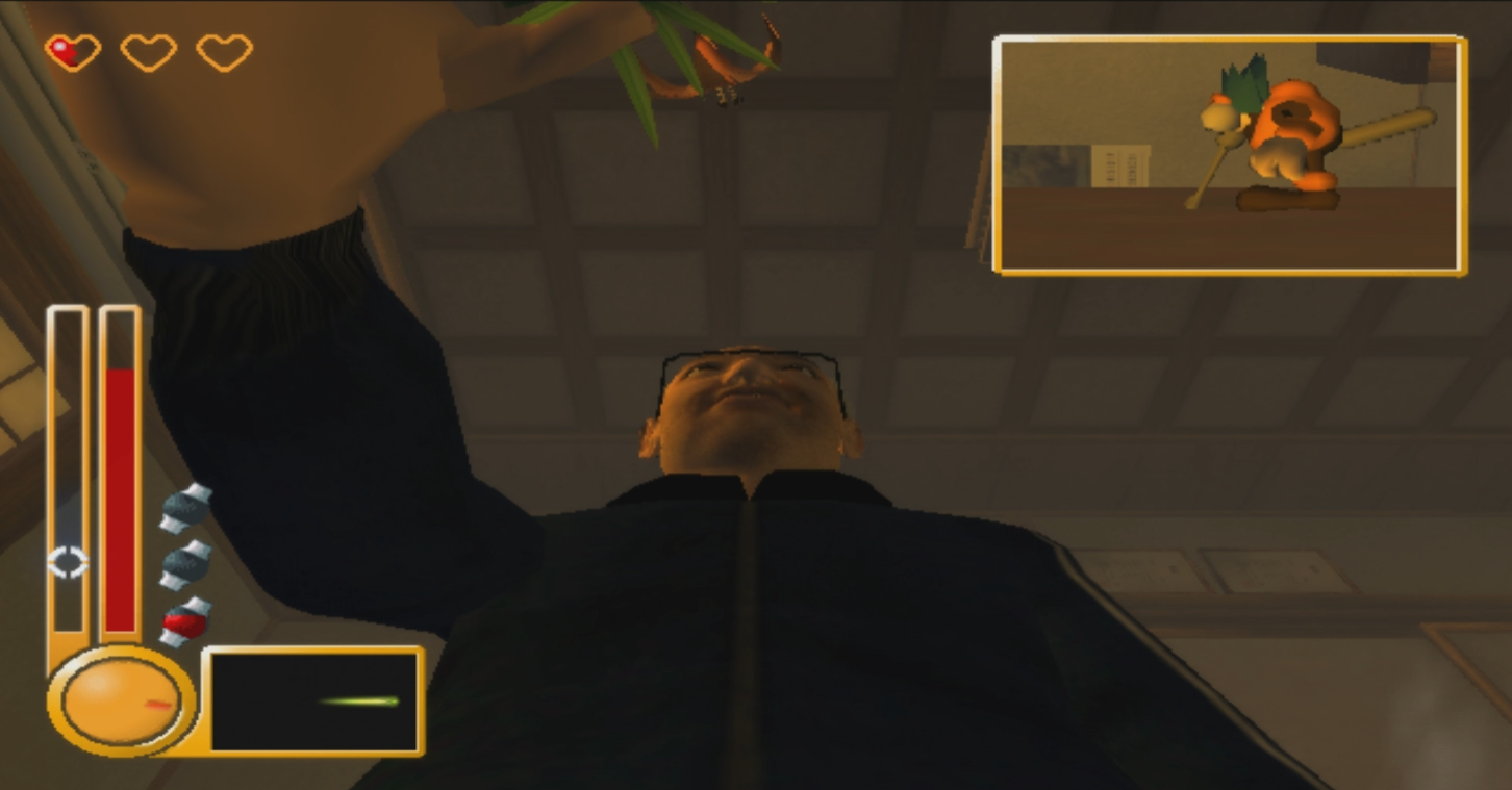 It has to be said though, that Mister Mosquito is very much a product of the time it released in, which is reflected the most in the various, somewhat unorthodox feeling control schemes that a lot of games featuring flying had at the time. Where nowadays you’d be able to control the characters movement with the left analog stick and the camera with the right, this game opts for a more traditional control scheme of using R1 to go forward, up and down on the right analog to go up and down respectively (in correspondence to the whims of the camera that is) and R2 to do a mid air drift straight out of the Initial D anime. Despite this, the whole game is designed in a way that allows you to slowly learn more of the mechanics as you progress through the game. It gives you ever more challenging stages with new mechanics, such as a bug zapper, bug spray or one of the incense circles stuck to Kenichi’s wonderfully comedic combover. Each stage also nicely varies the amount of objects that you can interact with to distract the members of the family, or to reveal weak spots. And the more you stock up for the winter, the more rotund your existence as a mosquito becomes. It makes you less maneuverable during your daring escapes. On top of all this you have to manage the stress of your targets to maintain optimal suckage.