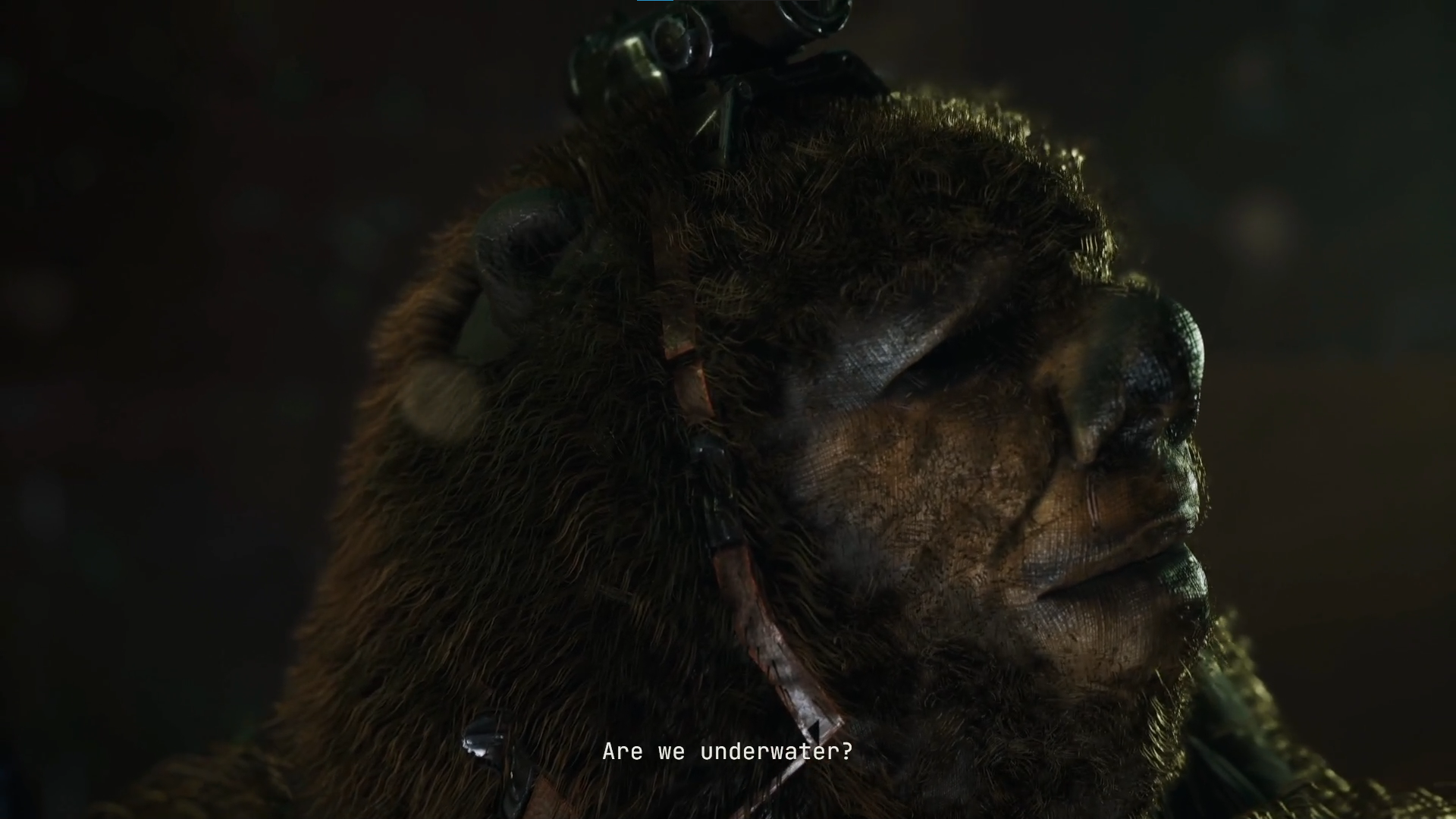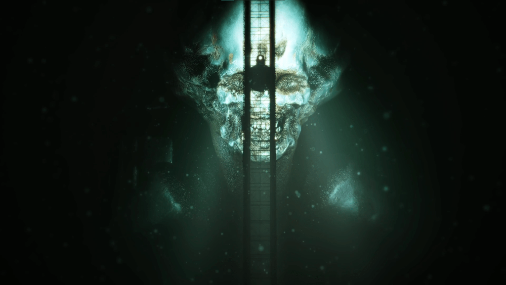 In Stasis: Bone Totem we follow Mack and Charlie, a married couple and salvage team, who stumble across a derelict oil rig of the CAYNE corporation in the middle of the ocean, seeing it as an opportunity to get enough salvage to pay off their crippling dept. From the very first steps on the rig things feel all kinds of wrong; equipment is littered around the place, either thrown to the side or hastily packed, without a soul in sight. Things seem to go from bad to worse when Charlie makes her way into the interior and stumbles across a skinned corpse, with the back of the ribcage folded open, spine removed and the intestines strung up like a pair of wings. The way Charlie brushes aside the body as something that they’ve seen before, even one as grotesque as this, goes a long way to introduce the player to the casual brutality of this world. Most of the game’s worldbuilding is done through personal logs and messages between researchers and employees that you can find on PDA’s that are scattered around. The first of which you find next to our bloodied angel. It describes experiments done in an underwater mobile laboratory, and that the rig you’re on, Deep Sea 15, is under lockdown by Cayne’s sec ops. Communications to the lab have been shut down and gunshots have been heard throughout the facility. To find out what happened here, power needs to be restored to the platform, and for that we need the help of our third, and my personal favorite, party member, Moses. Moses is an augmented super toy that’s shaped like a bear, and is their deceased daughter, Hope’s, best friend. Moses is easily the best part of this game, juxtaposing the grim and grotesque that you encounter with a child-like innocence, all the while spewing child safety PSA’s. His naïve personality often has him befriend corpses, tell Mack to mind his language and proudly proclaim that he’s a very smart bear when he does something helpful. It offsets the horror with a sparkling light that hops around to breathe some positive vibes into the darkness. With his help, the group manages to restore power to DS15 and find their way to the deep sea bell that connects the surface to the MULE. And with that, the descent into the main story as well as a whole lot of madness begins, framed by a beautiful wide shot of a massive skull watching over the group.