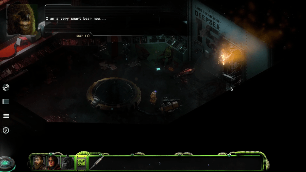The story of Stasis: Bone Totem is largely centered around the three main characters with the previously described narrative being used as a backdrop for their motivations. Charlie seems adamant to go deeper into the MULE to find something worth salvaging, whereas Mack is more reserved and cautious. For Mack, this is an almost sacrilegious act to disturb CAYNE’s work, but he is still torn between his faith and his daughter’s legacy. Before the events of the game, their daughter, Hope, died in a drowning accident in order to save Moses, whom got swept away by the ocean. With CAYNE essentially disproving the afterlife and God, and in proxy taking its place, they’ve monopolized the postmortem with a brain chip that uploads the memory of the deceased to the Nexus. Because Hope died without the chip, Mack treats CAYNE with a more cautious reverence, and holds that belief against a more unstable foundation, which gets challenged further into the game when Mack witnesses more atrocities committed by the company. It also complicates his relationship with Moses, given that he blames the bear for Hope’s death. Charlie seems more or less okay with the atrocities for reasons I won’t spoil in this review, but ultimately her dealings with Hope’s death becomes her sole motivational standpoint throughout this story. Moses blames himself for Hope’s death, now having developed a fear of water as a result of the accident, and constantly remarks how dearly he misses her. He’ll say things like “Sharks are Hope’s favorite thing” or “Hope would’ve liked this”. It makes the little bear one of the most gut-wrenching and endearing characters in the entire game, offering a sort of light at the end of the tunnel contrast to the bleak and grotesque of the world.