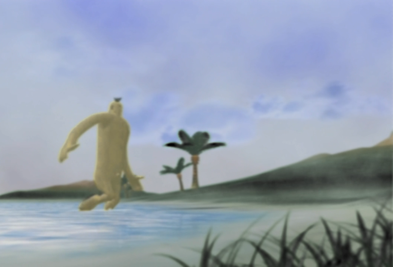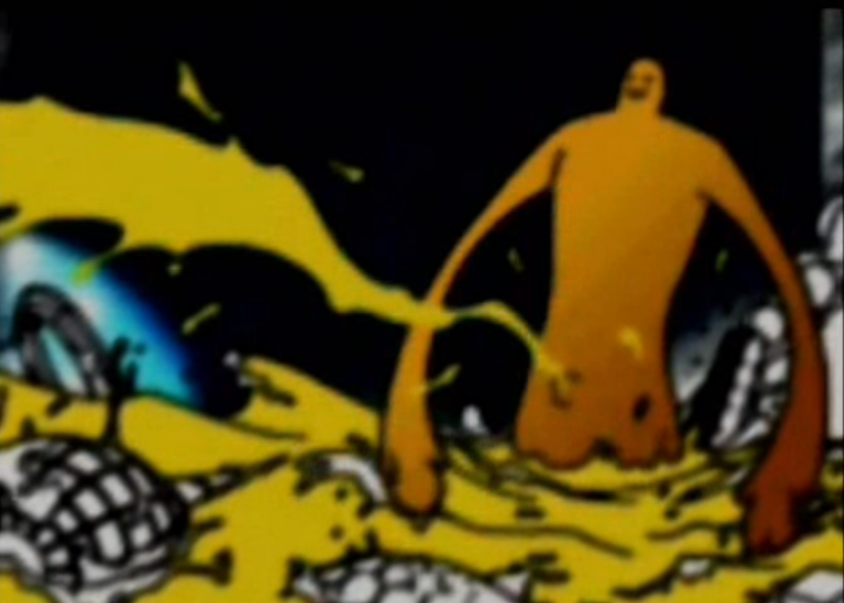 Doshin the Giant tells the story of the island of Barudo, where legend has it that a friendly yellow giant rises out of the ocean when the morning sun rises. This friendly giant, as you might have guessed it, is Doshin. A giant yellow smiley faced giant with long arms, 5 hairs sprouting out of his head and a suspiciously prominent belly button.