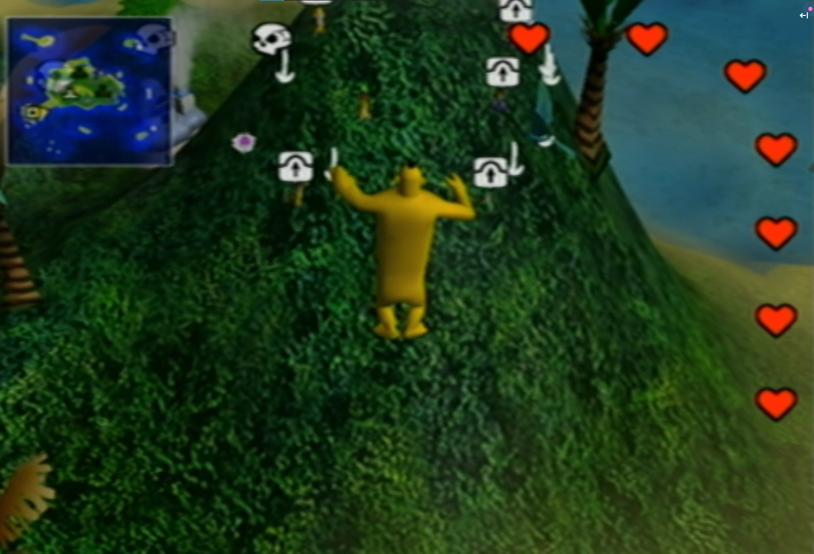 While the game feels somewhat lacking behind other titles of the time on the same platform, it doesn’t shy away from providing ample amounts of detail for you to explore. The villagers will respond with unique animations, in contrast to the wild flopping of the 64DD version, based on whether or not they like you. They also have roles within their villages; you’ll see people dancing around on balls to entertain the workers, farmers tend to the crops, and the animals are herded around the island. Sometimes a villager doesn’t feel like doing anything, but they are very useful to pick up and use as an improvised treasure detector when carried around. The buildings of the tribes are all different, inspired by older civilizations, and the monuments also present a lot of interesting details. Want to build the Great Pyramid next to the Aztec Temple, whom in turn is neighbors to Odin’s cabin? Well, do I have good news for you. Each monument is presented in pretty impressive detail, based on various civilizations that lived throughout human history.