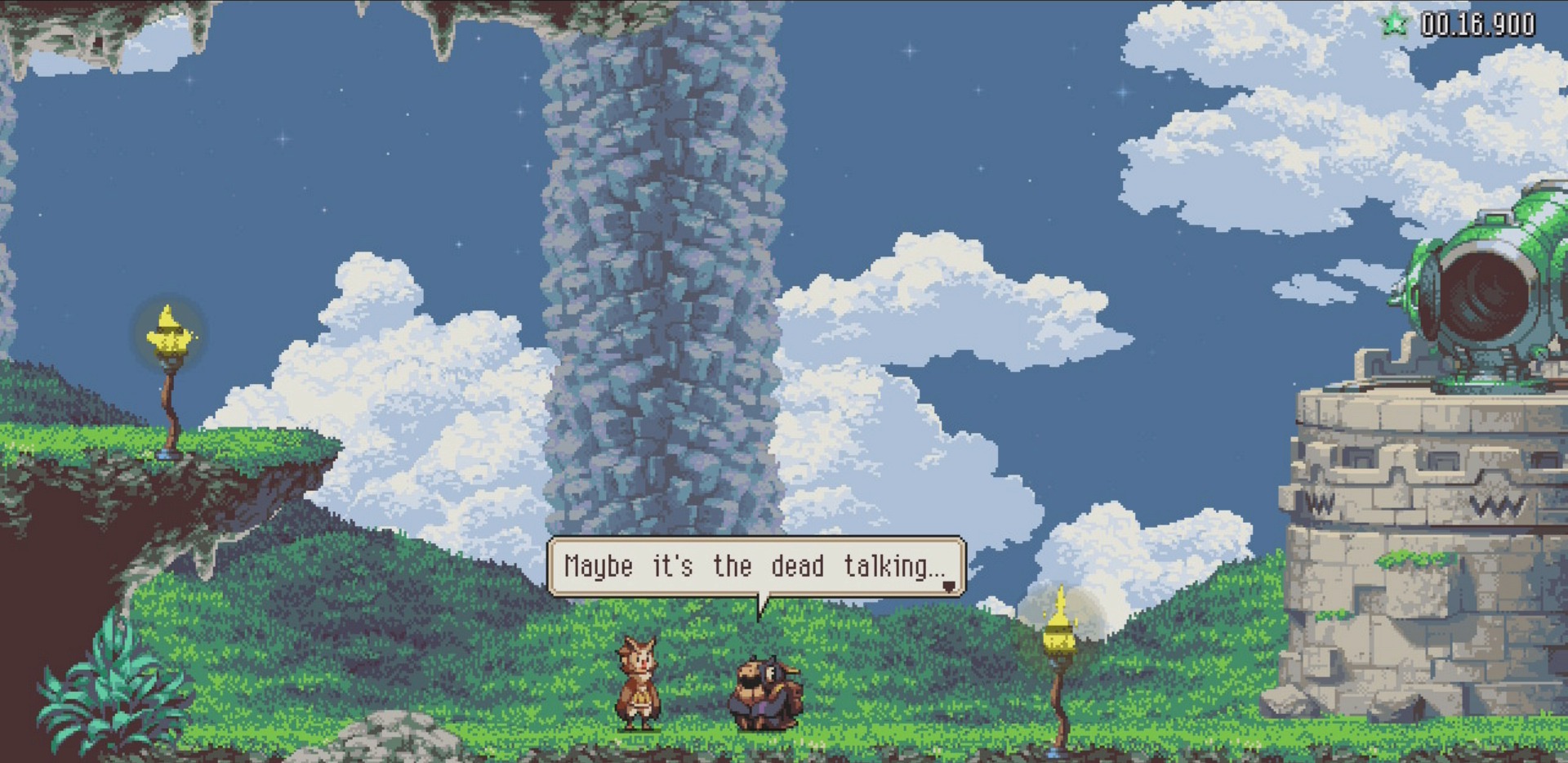 One of the strongest aspects of Owlboy is the way that the gunners are included into the narrative. While Otus isn’t the most brave or strong, he is an owl at heart. He stops at nothing to do the right thing and protect the ones he cares about, however, the rest of the cast gets to shine as the ‘missing’ facets of his personality. Geddy serves as not just his best friend, but also as a very important hype man that manages to pick Otus off the ground on many occasions. Alphonse presents himself as a more rational type, always having a plan ready, and he makes great use of the information he has on the pirates. Twig on the other hand has a certain false bravado to him that gives him a very uncompromising approach to sometimes dangerous situations. Throughout the game each character fills a specific blank within Otus from which he can learn and grow. In the inverse of that, the others find great faith in the brave acts of the little owl. Otus might grow throughout the story, but he doesn’t change entirely as a character. He’ll still show visible terror or distress near the end of the adventure. Within the story itself Otus will always be stronger with his friends and his friends will always be more complete with Otus. The way that a lot of the characteristics are conveyed wouldn’t be possible for the absolutely stellar work that Simon did to bring these characters to life. With just a few pixels, he managed to create a wide range of emotions on each and every character in the game. It creates a lot more nuance to the story and every conversation in the game.