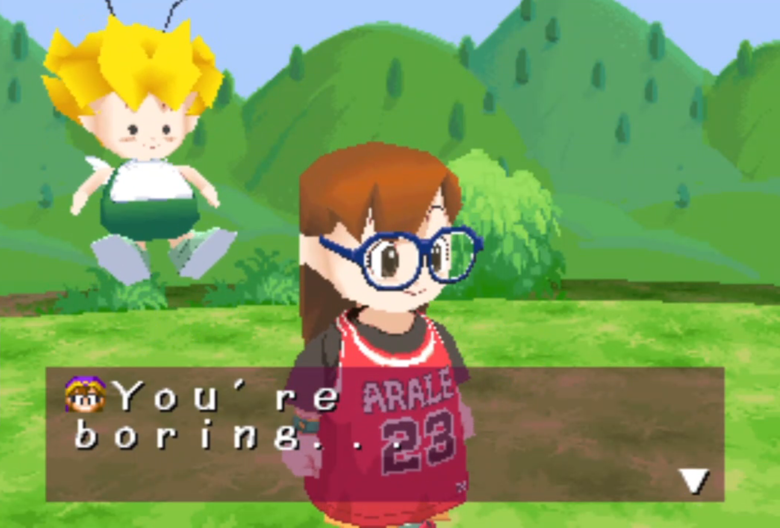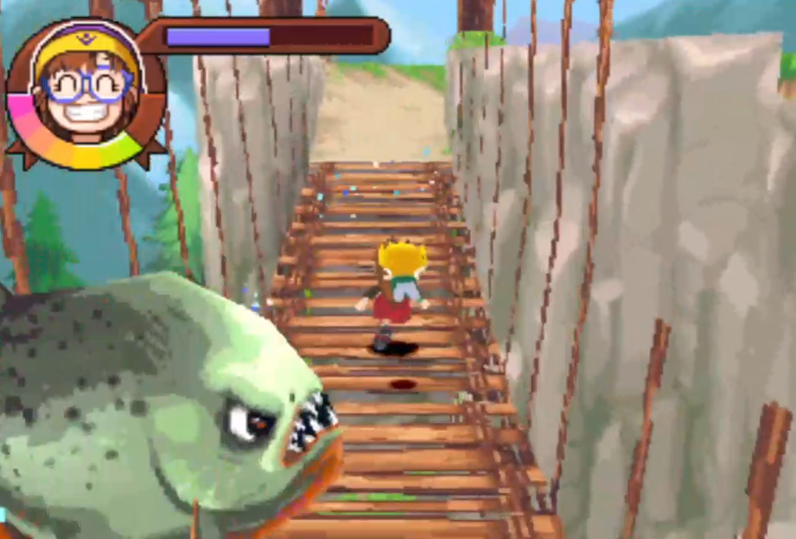 The action stages of this game are extremely hit or miss. A lot of the levels feel like additions made to the game to make it more of a video game. It does give the moves that you learn throughout the game a lot more use than extra means of traversing the village, but it’s implementation is somewhat lacking and, at times, mildly frustrating. Most of the platforming sections are built as 3D areas to explore, however a lot of the texture work gives off the illusion that the entire environment is a vertical 2D space. It doesn’t help that there are barely any shadows to give depth to the environment, nor does Arale have a shadow. This leads to incredible awkward platforming, where landing on a plateau becomes more of a guessing game than anything else. This is particularly egregious when you have to hop over a bunch of police cars as part of a story challenge. It’s not all bad though, the game is built around the idea that you’re never too far off from trying again. With unlimited continues and a slew of moves at your disposal, you always have something new to try or try again within arms reach. Unless you’re a hook that needs to be grabbed, that one was just mean. The gameplay is heavily flawed, but is ultimately rather innocent. The platforming sections serve more as a little distraction from the constant running around town and it does very much spice up an otherwise rather monotonous game. Plus we get to fart on dinosaurs and burp laser beams at giant frogs wearing crowns. At most the lack of depth and finnicky sliding will bring some momentary frustration to the table, but you’re always a click away from jumping back into the action and never too far off from where you left. Being able to revisit stages with the Time Slip (it literally slips and falls through time) device is a nice little touch and Arale using it to cheat on a school competition because she really needs to win is just perfectly on brand.