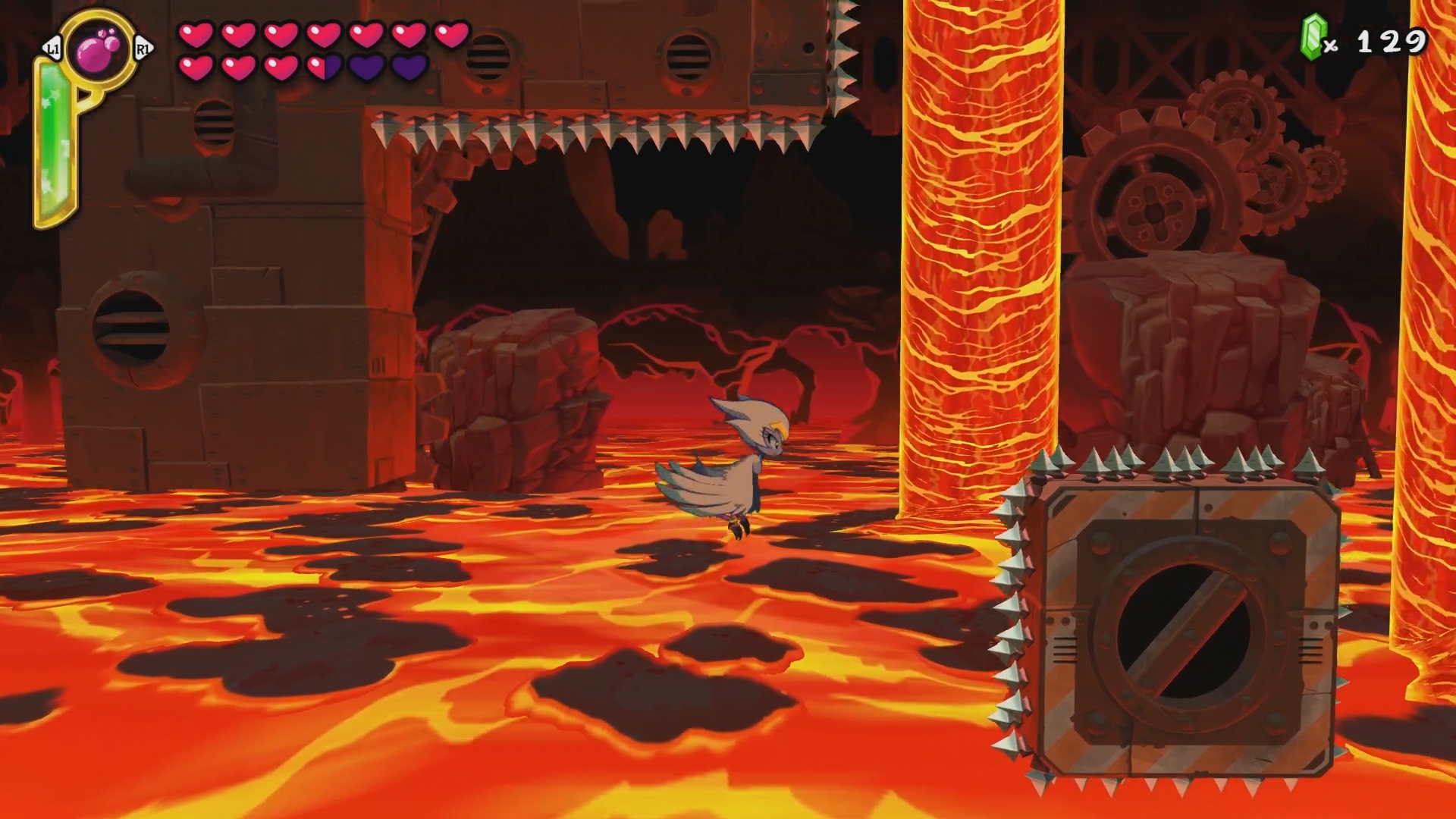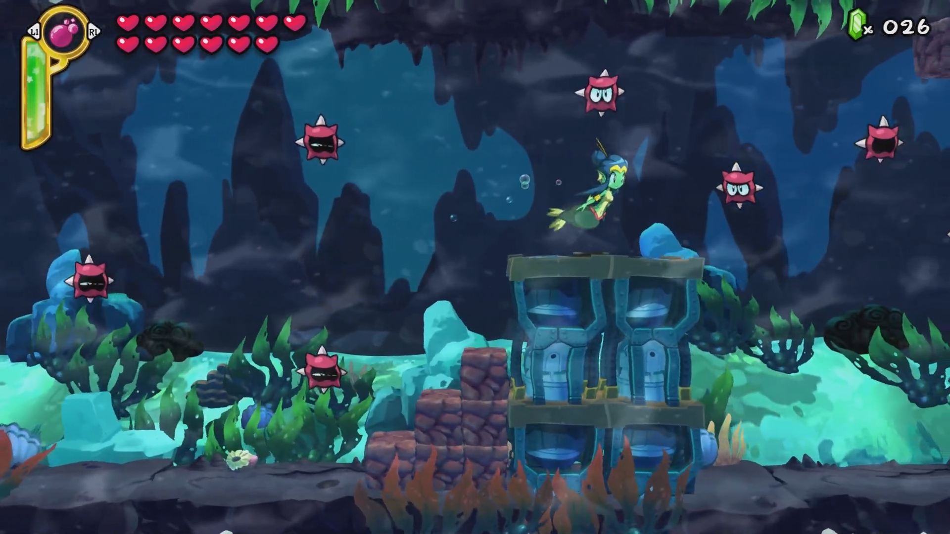 Half-Genie Hero presents itself as a set of stages that you can freely explore and revisit, with Scuttle Town serving as a hub area. While it’s not a metroidvania in the sense that you have a large interconnected world in which you find items that grant you access to other segments of the map, it is very much metroidvania in its overall design. Each stage can be completed by going from the start to the level and beating the boss at the end of the level, however, along the way you can find various items that give you access to hidden parts of these stages. One of the key gameplay elements is Shantae’s ability to transform into various animals to help assist in your exploration. The monkey allows you to enter smaller areas and jump real high, the crab lets you crawl on the ocean floor and snip angrily at trespassing toes and the elephant allows you to romp and stomp across the stage to break large boulders (and step on small, innocent flowers). The way that these transformations are implemented isn’t just good, it’s satisfying and rewarding. The levels are designed in a way that it’s very easy to remember what you can explore with the new transformations. Alongside the power to turn primal when dancing, Shantae also possesses powerful hair which can be used to attack enemies. You can upgrade the speed and power by purchasing hair care products at the item store in Scuttle Town.