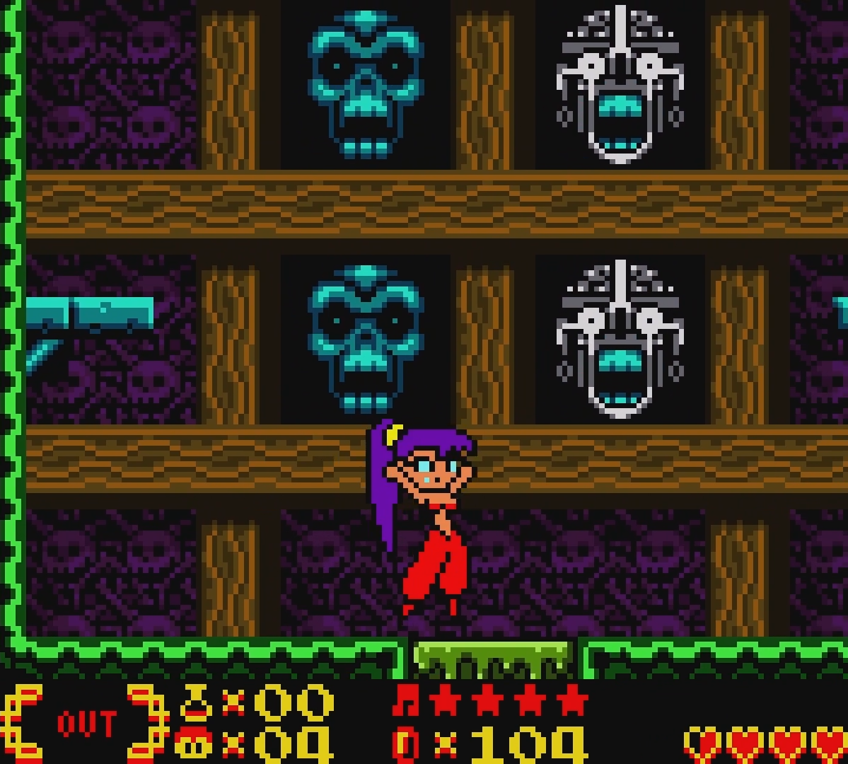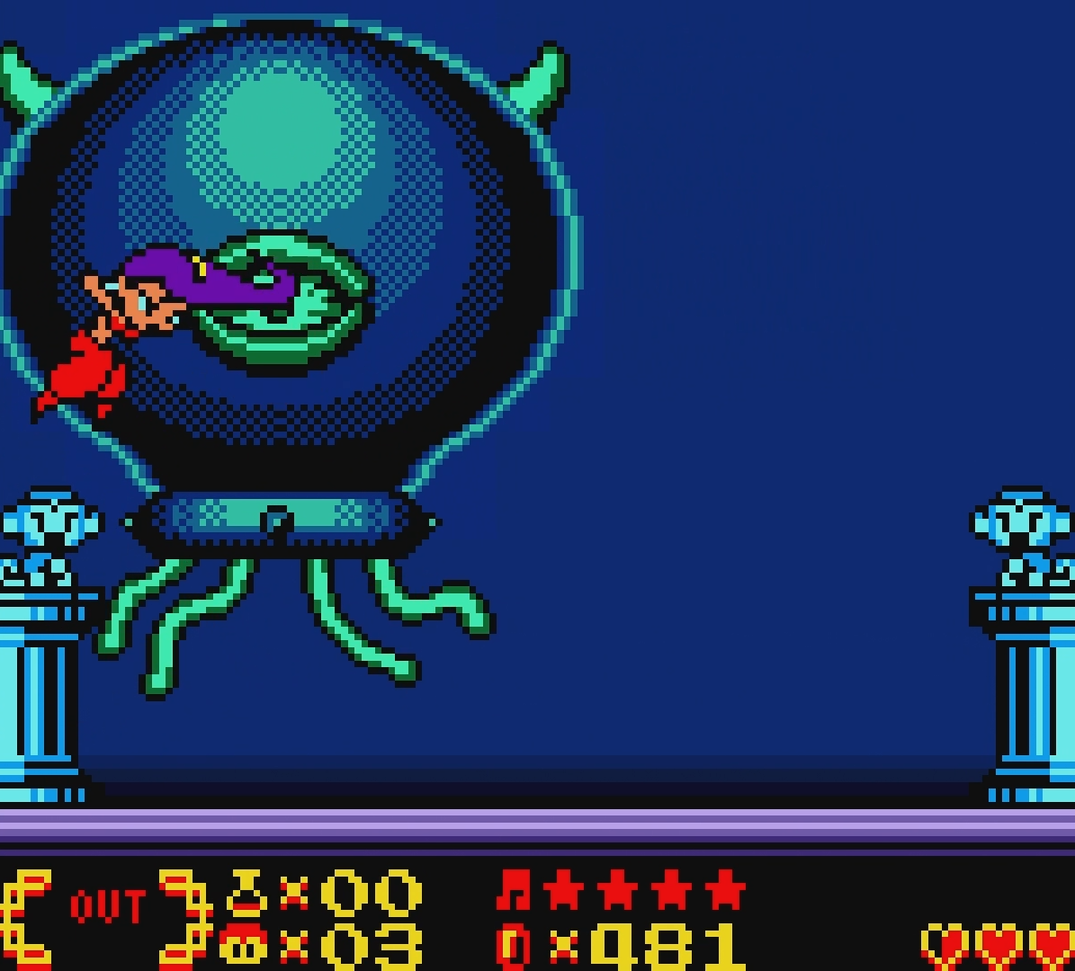 Shantae is a fantastically ambitious title that absolutely pushes the Game Boy Color to the brink. The day and night cycles add quite a lot of extra dimension to an already interesting world to explore, with certain areas only being reachable during either day or night. It creates a fascinating labyrinth for players to explore, both in- and outside of dungeons. This doesn’t make it less of a challenge, though. The game doesn’t pull any punches and will frequently leave you scrambling for heart containers once the sun sets. The dungeons are really well designed towards challenging the player in fun ways, and the bosses are a riot to fight. I do have to deduct some points out of personal bias for the lack of Squid Barons, though. Nothing personal. While the original Shantae isn’t my favorite in the series (that title belongs to Seven Sirens and Pirate’s Curse), it shows a lot of the passion the developers put into it. The mechanics feel fresh and unique, even in light of the entire series. The rhythm mini-game for the transformations took some time to warm up to, but after playing the game for a while, I found myself really enjoying both the mini-game and the thematic implementation. Shantae provides a surprisingly polished experience that lays the foundation for the rest of the series to build its identity on. It is a must play for fans of the series, though I’d recommend playing either Pirate’s Curse or Risky’s Revenge first to sample the flavors of the menu this franchise offers.