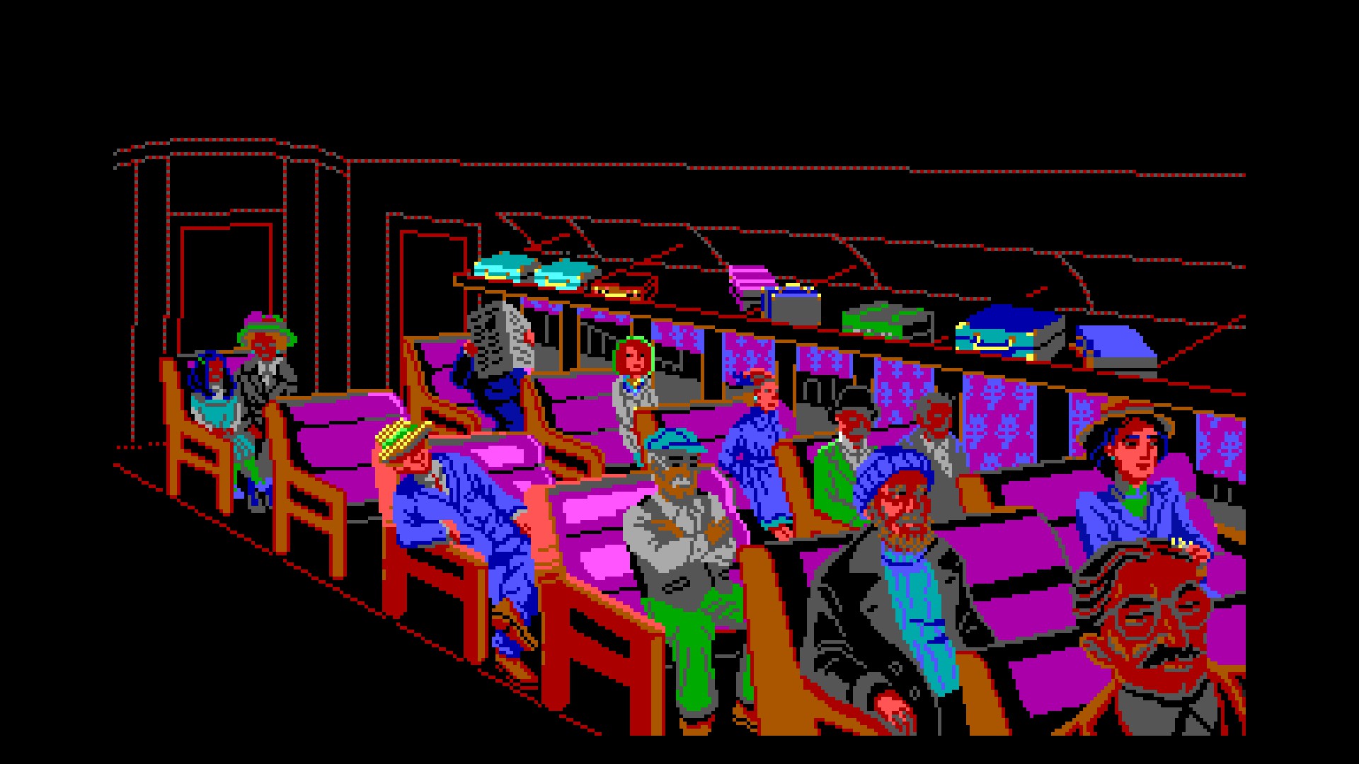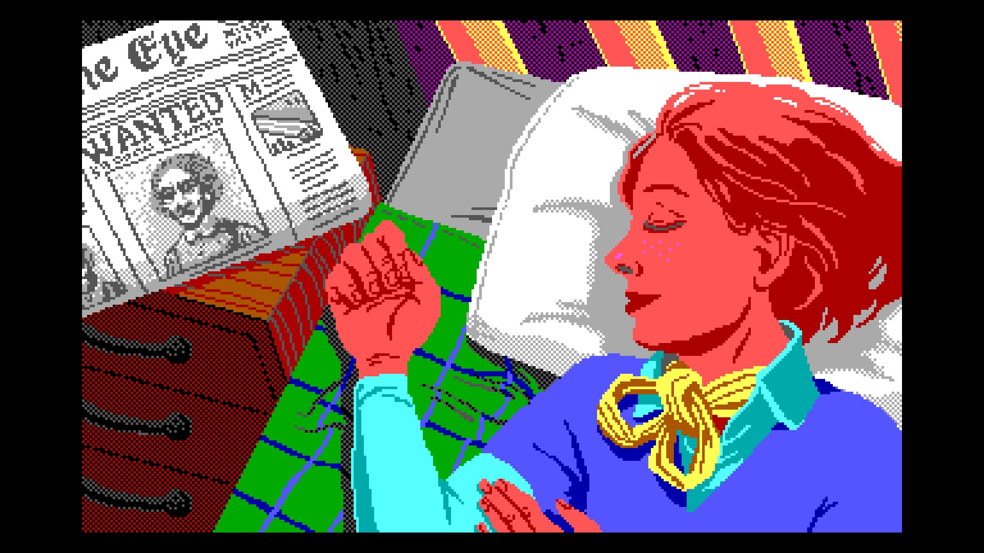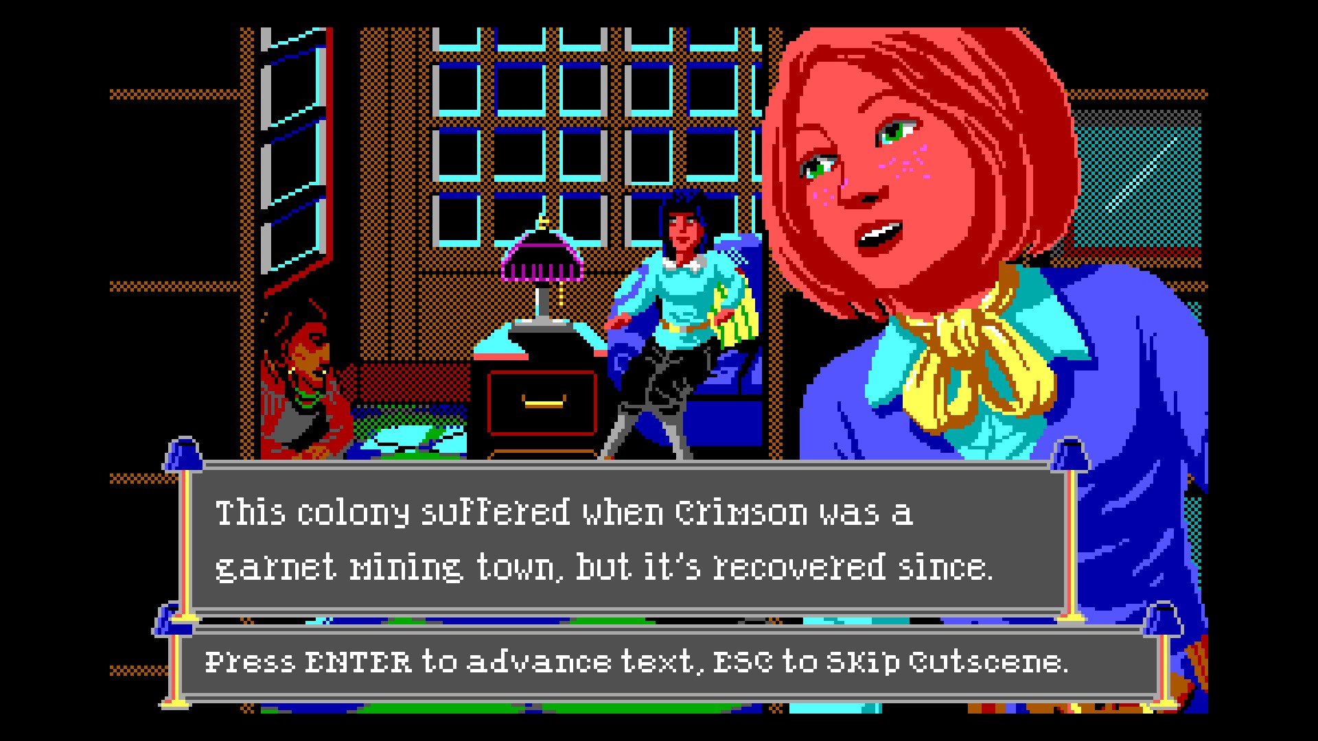 Developed by Julia Minamata, The Crimson Diamond pays tribute to the olden days of EGA powered adventure games, visually similar to the early days of Sierra Online‘s adventure catalog. Despite being released in 2024, the game has an aesthetic that immediately throws you back to the days where home computers needed separate extension modules to modernize your system to display 16 colors. The Crimson Diamond follows the adventures of Nancy Maple, an amateur geologist, as she is sent to the garnet mining town of Crimson to investigate a diamond that was found inside a fish. On the train to the small Canadian town she encounters Kimi, who is traveling to the same lodge, and the two of them decide to become traveling companions. Upon arrival at the station, Nancy, after falling asleep on the train, discovers her luggage missing. A bit of a rough start, but improvisation is one of her strong suits. From here we get taken to the lodge by the caretaker, Jack, in a rather fancy looking automobile. As you arrive at the lodge it quickly becomes clear that you’re walking in on an intense dispute within the family that owns the lodge.