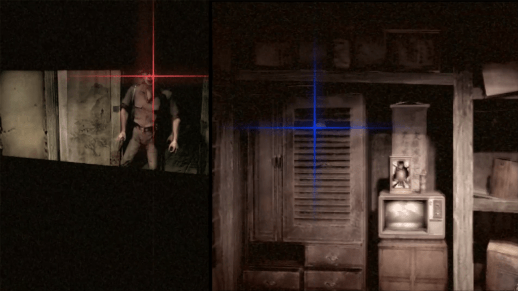 Enemies are constantly patrolling stages and tend to adhere to certain patterns. In a lesson taken from the Metal Gear games, this changes the stages from an obstacle course to a puzzle with high stakes. It’s constantly encouraged to spend some time to internalize the paths that the Shibito take, but also where they’re going to be looking at what time. Our characters are not equipped with a Soliton Radar, but they are capable of using a mechanic that made this series incredibly unique amongst its survival horror peers; Sight Jacking. As the name implies, this mechanic allows you to look through the eyes of an enemy. When Sight Jacking, you can select a target and observe the world through their eyes. This helps you determine the way that the Shibito move around a stage as well as where they’ll be looking. As said, the Shibito are highly observant, so entering their field of view with so much as a pixel will cause them to lay in a pursuit course. When you’re spotted by a Shibito, the screen will split vertically to show you on the left and the hunter on the right.