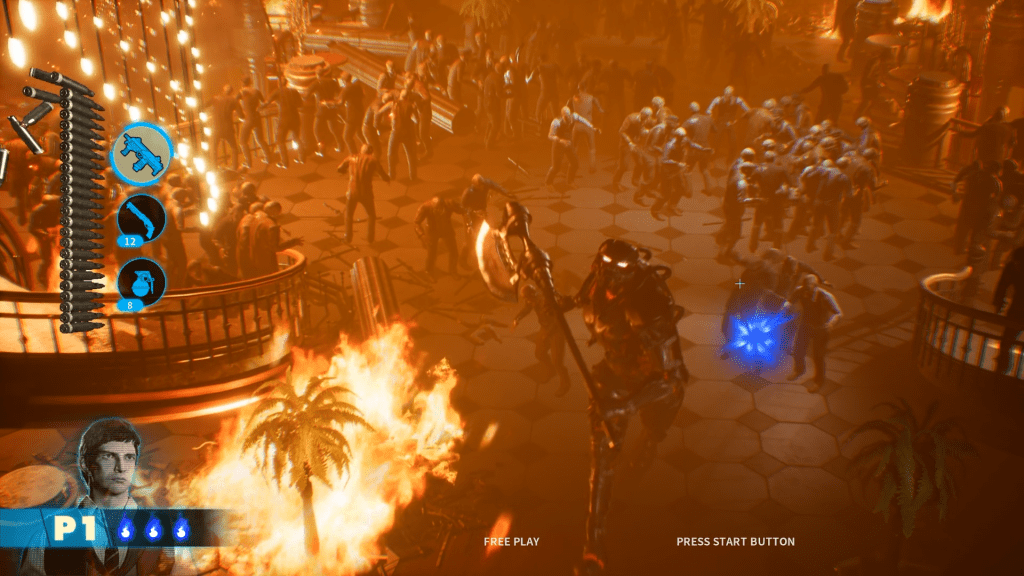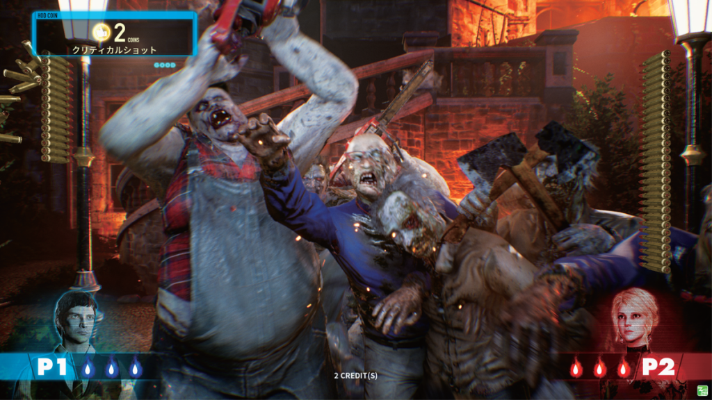 The gameplay in House of the Dead: Scarlet Dawn feels incredibly smooth, with only a few frames dropped during the extremely hectic areas. I only noticed this happening three times when multiple waves of zombies filled the screen. And I do mean filled. There’s so many targets on screen at all time that the moments when you clear a wave feel like you can take a deep breath, before diving under in the next wave. The game does seem a lot more forgiving in comparison to earlier entries in the series. Zombies have less of a tendency to continue moving after being dismembered, and the heavier enemies fall easily to the enthusiasm of two players. It makes this one of the more accessible games in the series, but do be prepared for the other entries to bare their fangs a lot more. Overall I think I only died 2 times in total, which felt impressive for an initial run of the game.