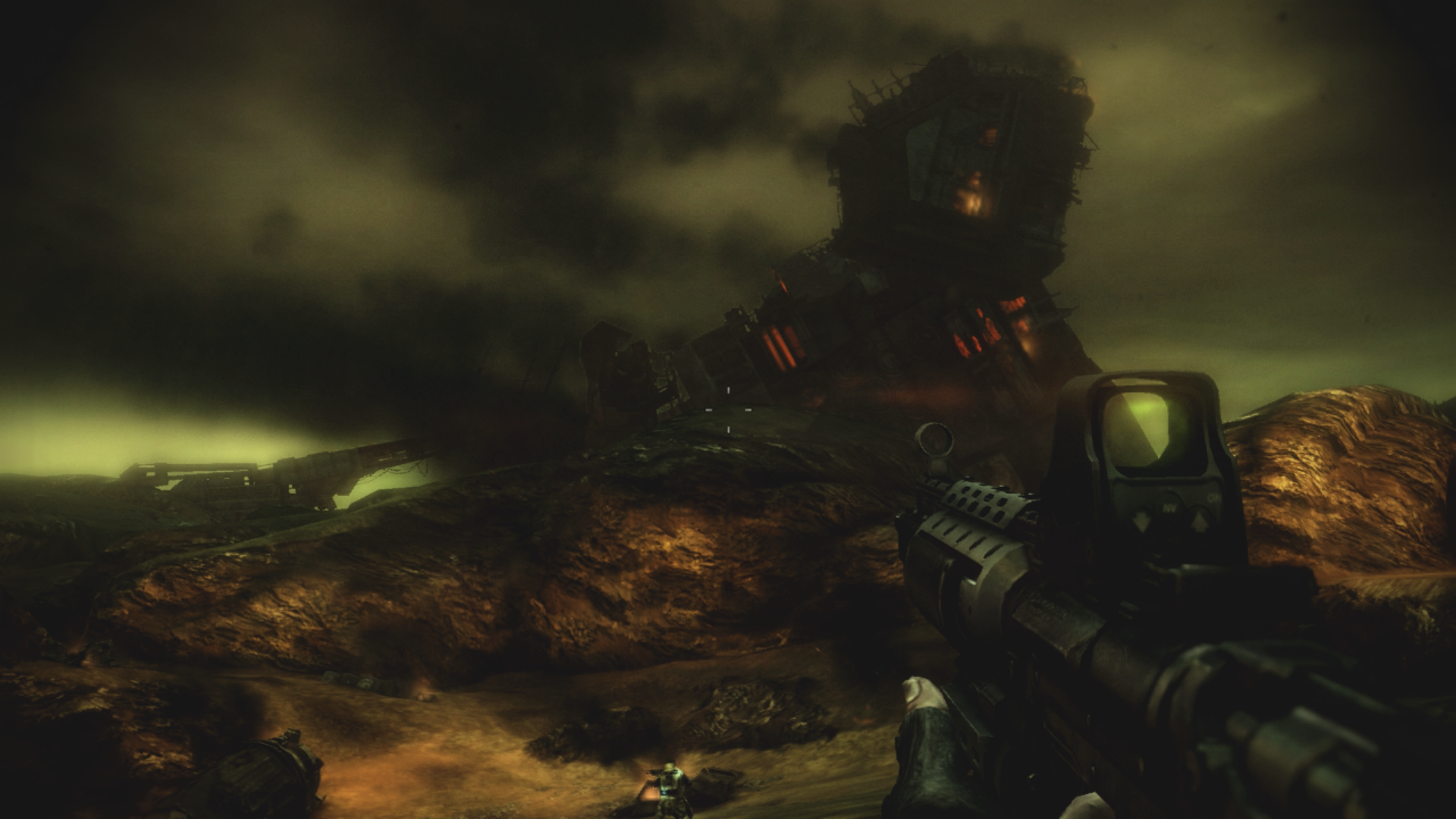 The presentation of Killzone 2 is incredibly well done. While the game sometimes goes a bit overboard with the darker areas, it does create a wonderful opportunity to create a bit more atmosphere. This is particularly present during some of the areas in which you fight in dark abandoned buildings. The darkness is only interrupted by the glowing red and orange eyes of the Helghast helmets, in a way that’s taken straight out of Jin-Roh. The downside is that it often is very disorienting to move around, but it does look very cool and intimidating. The outdoor areas are rather well designed as well, with a lot of the megacities remains serving as a backdrop for you to navigate. Gigantic factories are intertwined with apartment blocks in an industrial dedication to Helghan devotion. Everything is densely packed, and it is beautiful for it. Not to mention the absolutely staggering animation on the opening cinematic of the game. Visari’s speech provided a look into what the studio was capable of in terms of animation and visual design, and still feels like an incredibly realistic and menacing sequence.