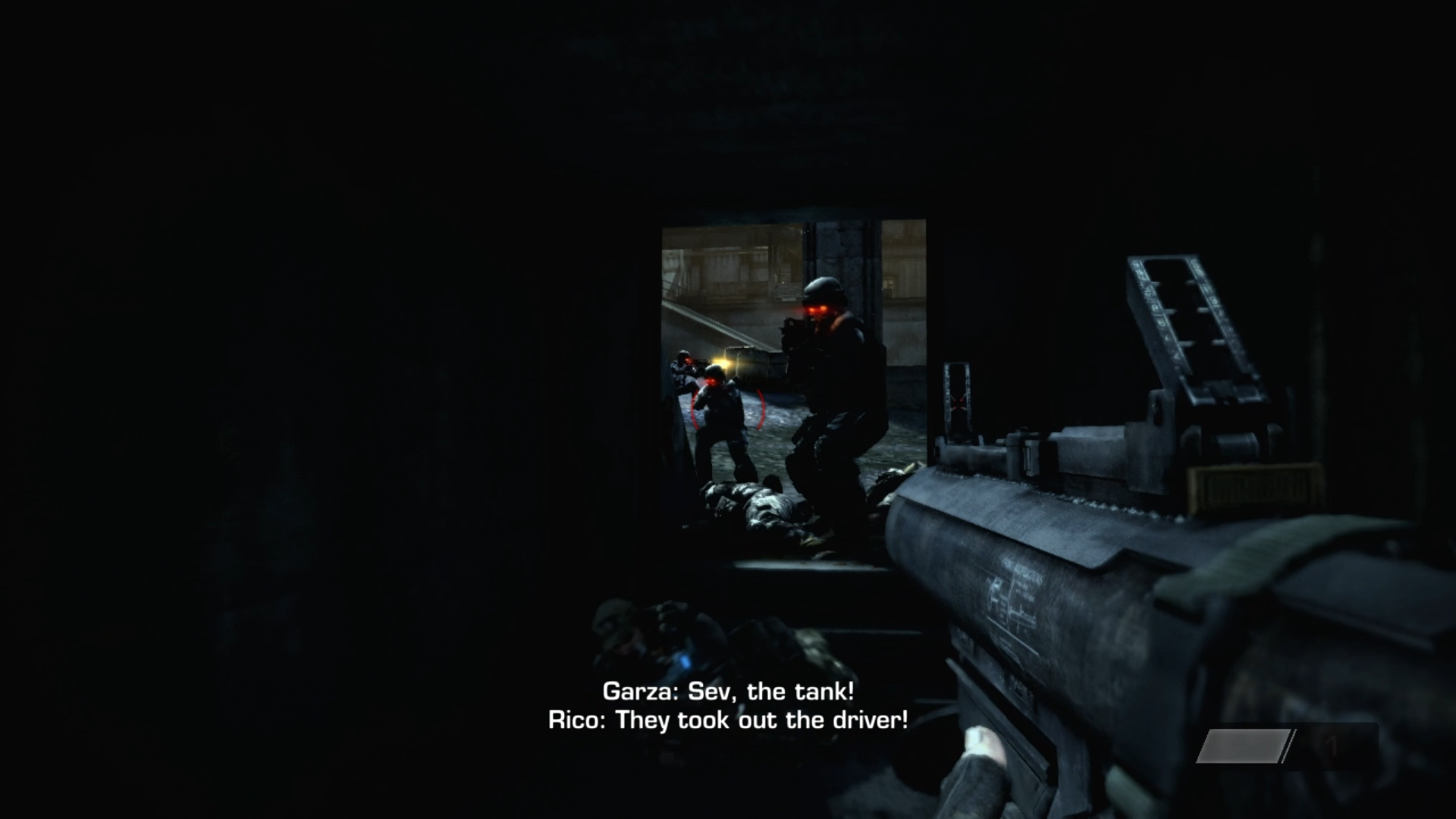 The primary gameplay elements consist of shooting Helghast and ducking behind cover. With the press of a button you can snap to, and crouch behind, improvised cover. Every pillar, every piece of large rubble, can become a staging ground for a firefight. But make no mistake. The Helghast are tenacious, and they will try to get you to leave your pillar of refuge. Much like the way that enemies behave in the incredible F.E.A.R., so too do the Helghast. The first time this becomes evident is when you’ve just landed on the planet. You’ll find yourself in a firefight to take a beachhead. This section is a quick lesson in staying alert, as the moment you snap to cover the enemies will start moving into flanking positions, while grenades fly from the cover of an armored vehicle.