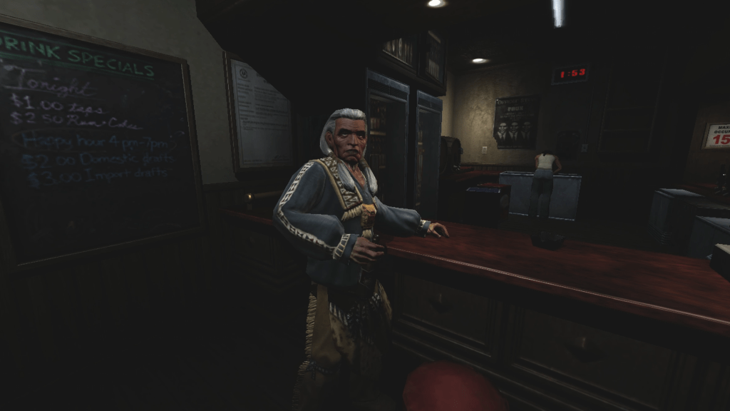 Prey follows Domasi “Tommy” Tawodi, a Cherokee mechanic and former soldier living on a Native American reservation. The game starts in a bar run by Tommy’s girlfriend, Jen, as Tommy is staring into the mirror, venting about his discontent with living in the reservation to his reflection. Upon leaving the bathroom we encounter our grandfather, Enisi, giving Tommy some heartfelt advice about the recent fight between him and Jen. When Tommy enters the bar, he pleas to Jen one more time to leave the reservation with him. A few of the bar’s regulars start accosting Jen, causing Tommy to beat them to near death as the roof of the bar is torn apart by a green light. The mysterious light starts pulling his grandfather and Jen into an unknown vessel, while the jukebox starts playing Blue Oyster Cult’s Don’t Fear the Reaper.