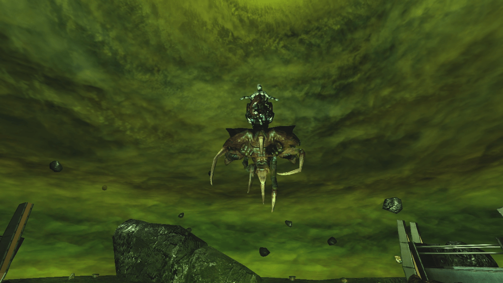 The final battle of the game takes place in the central control chamber. Here we fight Mother, a being whose powers seem to reach divinity. After the control of the Sphere is wrestled away from the control of Mother, Tommy acquires near god-like powers as he takes over the gargantuan living vessel. The temptation that this power brings nearly drives him from his goal of destroying the Sphere, but thanks to the wisdom of Enisi he manages to resist and fly the vessel into the sun. In a post credits scene we cut to Tommy having rebuilt the bar. A portal opens up and Elhuit steps through, claiming that higher powers wish to meet with Tommy. With this promise of a new grand adventure in this brutal universe, the game fades to black and three words appear on screen.