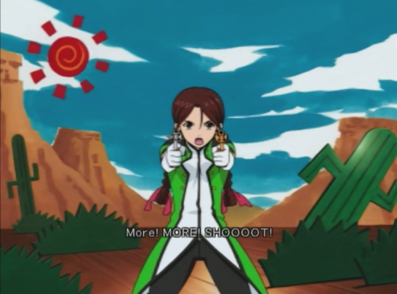 The next member of the revue to take the spotlight is Rikaritta Aries, Rika for short. A young bounty hunter with the energy output of a nuclear reactor. At first her demeanor caused some sense of frustration as the character seemed to be as happy as a person as she is on the trigger. This didn’t last very long, however, as Rika’s backstory unfolds and my initial frustration towards her turned to sympathy. Her chapter is, next to Gemini, and in my opinion, the strongest in the game. When Rika was growing up, she traveled the country alongside her gunslinging father, a performance artist. One faithful day Rika falls into a river during a storm and is saved from drowning by her father at the cost of his own life. Now Rika is left with a crippling fear of failure that is hidden behind the performance act she once saw her father do.